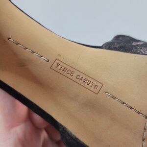 Vince Camuto EUC Akido platform T-strap heels in black and silver. Suede leather upper, black suede and a metallic gunmetal silver tone treated finish on Suede. 5inch heels and 1 inch toe platform.