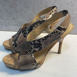 NINE WEST Snakeskin Cork Bottom 4” Heels Crossover Straps Sandals Classic 8.5M