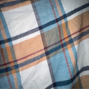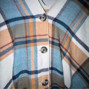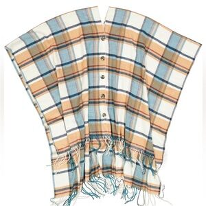 Stylish plaid ruana shawl poncho with button-down design. Features cream and blue colors. Hi lo with fringe. One size fits most. Gorgeous, hardly worn. Approx 49” at longest point falling naturally from hanger.
