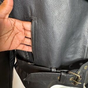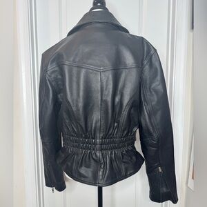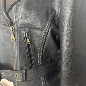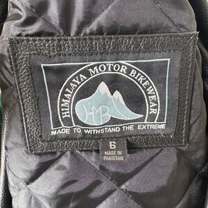 Himalaya Motor Bike Wear Women’s Black Leather Motorcycle Jacket, Sz 6 is in good preowned condition. There are two areas with small rubbing. They are photographed. This jacket is lined and has beautiful detailing like buttons, zippers, pockets and braiding. Reasonable offers considered.
