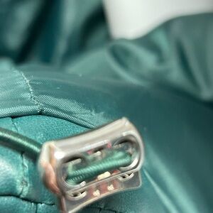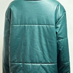 Stay warm and stylish with this teal puffer jacket. Perfect for chilly days, it offers both comfort and fashion. There are 2 pockets on the exterior. The coat is lined with teal green nylon. It zips closed.