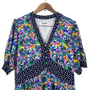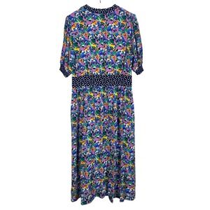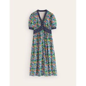 Keywords: Boden dress, floral print, maxi dress, v neck, puff sleeve, polka dot trim, women's dress, bright floral, summer dress, spring dress, statement dress, feminine, whimsical, garden, cottagecore, colorful