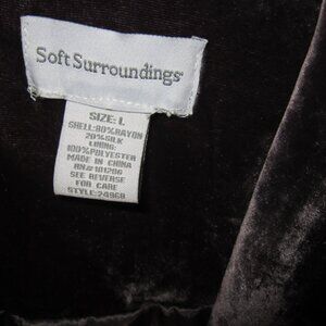 Beautiful size Large button down silk and rayon true velvet duster coat from Soft Surroundings. The coat is very soft and is a beautiful earthy brown color with a hint of purple to my eye. A great neutral sort of color that will go with many things.