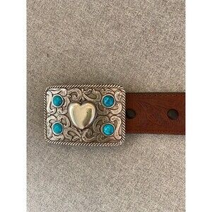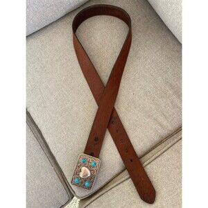 Add standout western style to your everyday jeans with this Nocona womens belt, size 36. The brown genuine leather strap features a tooled floral scroll pattern, paired with an ornate silver-tone buckle showcasing a raised heart center and turquoise-color stone accents. Perfect for rodeos, country concerts, nights out, or adding cowboy flair to casual outfits with boots and denim. Condition: Pre-owned.