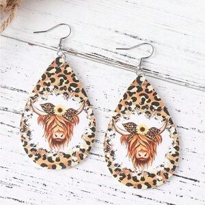 Boho festival wood earrings Highland Cow & Leopard teardrop shape design