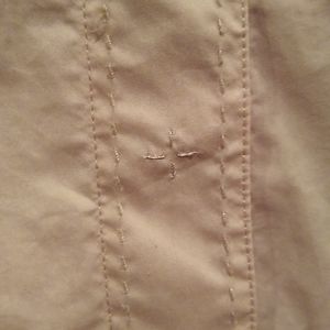 smoke-free home. a brown tan color top. hidden snap buttons. material is actually 77% cotton 25% nylon and 4% elastane. size small or 6. has some stretch to it. arms also close with a snap. just lightweight for summer. the snap around the arm measures 5 in across or 10 inches around. would be great to wear this summer.
