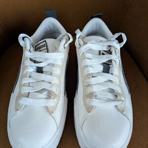 Very stylish Puma Mayze white-parisian night. Denim blue, white and gray/cream stacked sole sneakers. Only worn 2 times. Like new!!!!! Women's size US 9