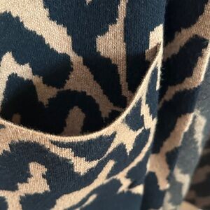 Stylish open-front hooded cardigan. Features bold animal print. Very soft; medium weight. Cozy. Perfect for layering.