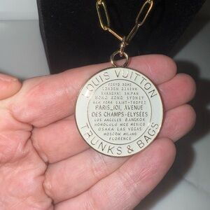 Chic gold pendant with Louis Vuitton branding. Features global city names. Adds luxury to any look.