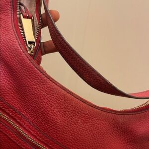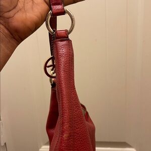 Great hobo style! Elegant red leather bag. Features gold-tone hardware. Front zip pocket. Iconic MK charm. Has a couple of spots that show wear. Reflected in price.