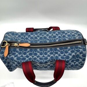 Rare Coach Archive Collection denim duffle bag w/ iconic Signature “C” jacquard denim, bold red webbing straps & premium leather trim. This is a limited edition archival reissue, created to bring back a classic Coach silhouette using heritage materials.