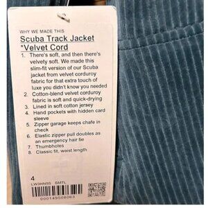 Lululemon Scuba Track Jacket (Velvet Cord) NWT | Size 4 | Storm Teal
