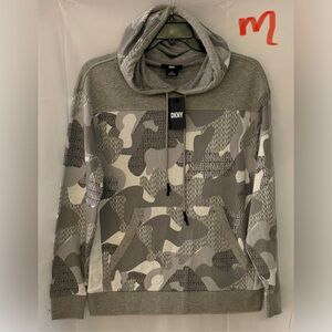 Stylish DKNY hoodie with a camouflage pattern. Features a cozy hood and modern design.