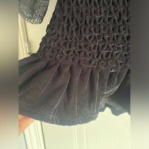 Luxe, heavy-weight black velour creates the ultimate midnight silhouette. This NWT Free People duo features intricate smocking and a dramatic open tie-back for a witchy, romantic vibe.