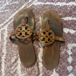 Classic Tory Burch Miller thong sandals featuring the iconic cutout logo and timeless brown leather. A warm-weather essential that pairs effortlessly with dresses, denim, and everyday casual looks.