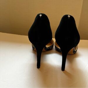 These Sam Edelman heels feature a sophisticated d'Orsay design with a striking black base adorned with vibrant floral embroidery. The slim heel and elegant pointed toe create a timeless silhouette, perfect for adding a touch of elegance to any ensemble.