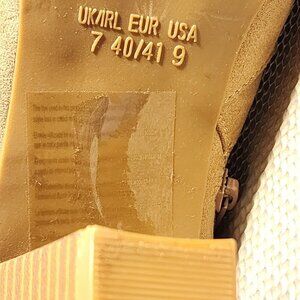 These are women's tan suede ankle boots with a stack heel, Western cow cowboy cowgirl style, and a round toe. They have a zip closure and are size 9 in US sizing and 7 in UK sizing. The model is Suede Stack-Heel and the upper material is suede. office siren, corpcore, officecore