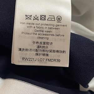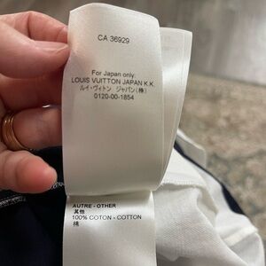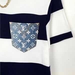 This Louis Vuitton T-shirt dress combines comfort and elegance, featuring bold navy and white stripes with a signature denim monogram pocket detail.