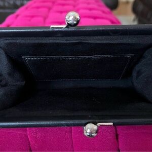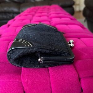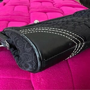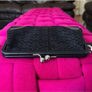 Elegant black wristlet clutch. Signature Coach pattern. Silver clasp detail. Perfect for any occasion. It does have one call out on the corner, a little bit of rubbing.