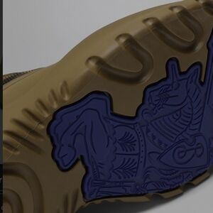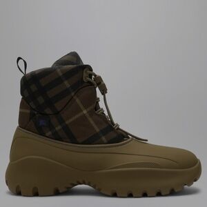 The men's Burberry Check Scoot Trek boots in furrow are designed for the rain and feature woven Burberry Check uppers with a matte rubber overshoe, shield toggle at the drawcord laces, and chunky rubber soles moulded with the Burberry Equestrian Knight Design.