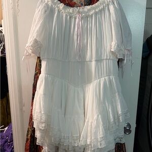 Charming ivory cape with dramatic ruffles. Ideal for bold fashion statements. Picture is of the dole whip color this one is ivory.