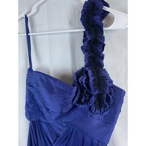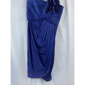This is a BCBG Maxazria navy blue cocktail dress for women in size XS. It features a one-shoulder neckline, solid pattern with pleated and ruffle accents, satin fabric with a zipper closure, and a mini pencil dress style. The dress is designed for party or cocktail occasions and is lined, with asymmetric design and stretch material for a comfortable fit. It is a designer piece with a classic and sexy theme, suitable for all seasons.