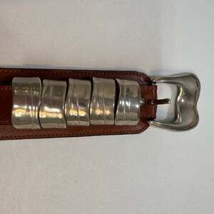 Vintage Onyx Brown Leather Belt, Western Ranger Style, Silver Tone Buckle Set. This high-quality accessory features a sturdy brown leather strap accented by a striking silver-tone five-piece ranger buckle set, including buckle and a matching tip. The bold, sculptural silver elements provide a refined Y2K or southwestern aesthetic. Made from genuine leather with a smooth finish. Good vintage condition with some light surface wear to the leather and natural patina on the metal hardware, consistent with age. Perfect for elevating denim or cinching a dress for a classic Americana look.