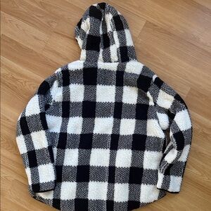 NWT Cozy plaid hooded Sherpa jacket in black and white. Perfect for chilly days. Features pockets, zip closure. Pristine.