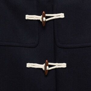 Wool mix fabric. Cloth. Short design. Straight design. With hood. Long sleeves with buttoned cuffs. Two side pockets. Toggle button fastening. Inner lining.