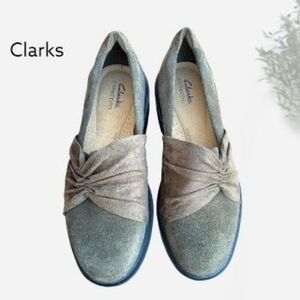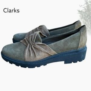 Clarks Calla Style Ruch Leather Suede Flat Loafer Dress Shoe Olive Tan Women 9.5