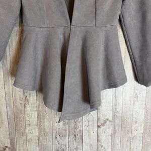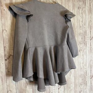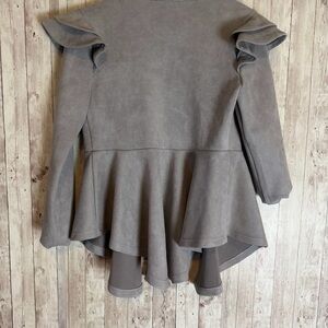 Size small Akira gray faux suede peplum jacket with ruffled sleeves, angled hem, and single hook closure in front. Polyester/spandex blend.