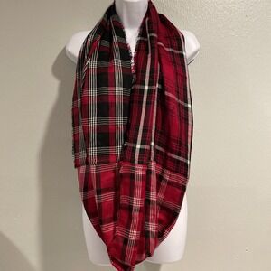 j.jill Red Multi Mixed Plaid Infinity Scarf 64 x 20. Gorgeous 100% acrylic infinity scarf with true red as the main color and differing black & white plaid patterns dispersed with the red. Eyelash fringe on both sides. Euc