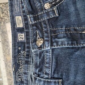 Chic Miss Me dark wash boot cut jeans with sparkling black beading, silver studs, & sequined details on back pockets. Perfect for a stylish look. Excellent condition except for a few of the beads missing on the right back pocket which is barely noticeable (see last photo). Size tag says 34 length, but these have been hemmed to 31". Note they were not cut off, so hem could be taken out (see 2nd to last photo).