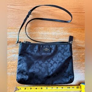 New without tags. Sleek and stylish black Signature Coach crossbody. Features iconic monogram pattern. Perfect for everyday use. Silver hardware. 3 interior pockets. Please let me know if you have any questions.