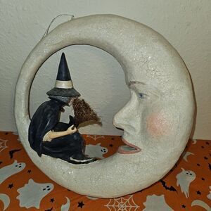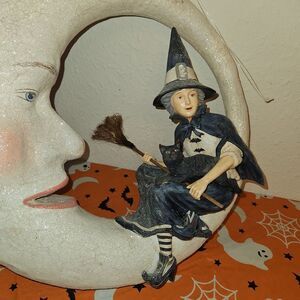 Soaring through a midnight sky by broom, a sweet witch and her little black kitty fly by. Made from paper mâché and resin with sparkly glitter detailing, this intricately detailed hanging piece makes an elegantly stunning accent. A gorgeous collector’s item, Moon measures 16" in diameter.