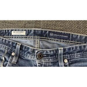 These AG Adriano Goldschmied 34X34 The Matchbox Slim Straight Faded Jeans are a solid dark blue color with a slim fit and straight leg style. Made of cotton denim fabric, they feature a button closure and are machine washable. The design is inspired by the USA, city, and preppy themes, making them a versatile wardrobe staple for any season.