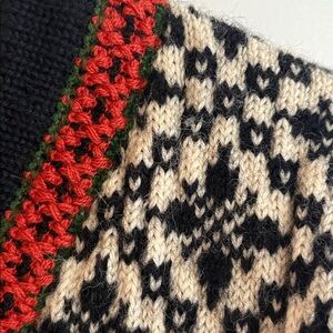Classic Nordic pattern. Rich red accents. Button closure. Ideal for layering.