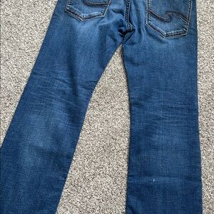 A pair of Silver Dark Blue Wash Zac Jeans. Relaxed fit, Straight Leg style. Designed for Comfort sitting just below the waist with extra room through the hip and thigh and a clean straight leg opening wide enough for boots.