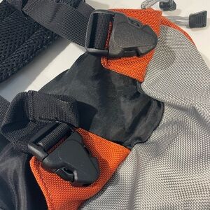 OllyDog backpack in vibrant orange and gray. Features multiple compartments and adjustable straps.