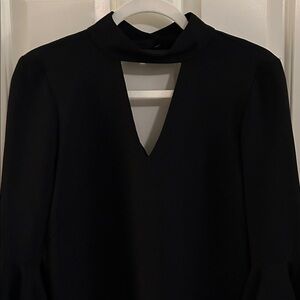This elegant black women's top features a stylish V-neck and bell sleeves, perfect for any occasion