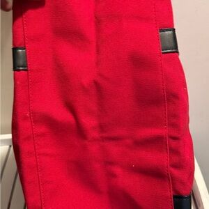 Chic tote with vibrant red fabric and sleek black accents. Ideal for daily essentials. this purse comes from a smoke free home.