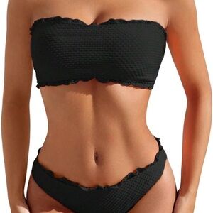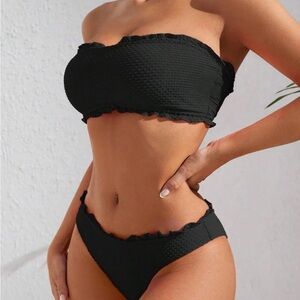 Experience ultimate style with this elegant black strapless Bandeau textured bikini set. Perfect for beach outings, this swimwear combines comfort and sophistication. Adjustable tie back and high cut bottoms. Size Medium, new with tags.