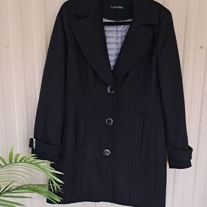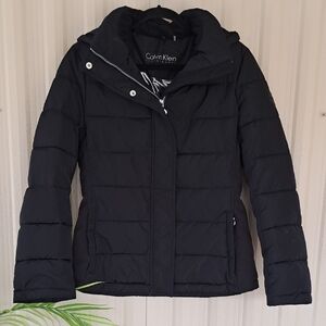 Stylish and warm womens horse riding jacket in navy and pink. Perfect for chilly days. Insulated and rain repellent material. Rolled attached hood at the neckline. Reflective strips on sleeves that can be rolled up or down. 5 pockets. Air vents in the arm pits. Sleeves at the cuff zip up or down. Side zipper to access the inside of the jacket. Flap on bottom of the back for comfortable riding. There looks to be paint on the fabric at the top of zipper on left arm. Front left pocket has a piece of fabric on pocket unsewn.