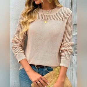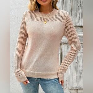 New Sheer Mesh Knit Panel Pullover Top Sweater Beige Tan