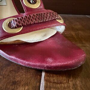 Jimmy Choo Napa Watersnake T-strap burgundy heeled sandals.