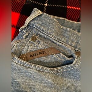 Stylish light blue jeans by Ariat. Straight fit for comfort and style.