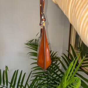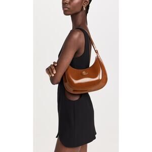 Absolutely breathtaking and highly coveted Tory Burch Robinson Spazzolato Convertible Crescent Bag in the rare Dark Sienna colorway. This bag is a modern icon, featuring a sleek, architectural crescent silhouette and a high-shine spazzolato leather finish that radiates luxury.