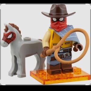 The figure is designed in a Western or Wild West style and includes a lasso and a "Spider-Horse" accessory.