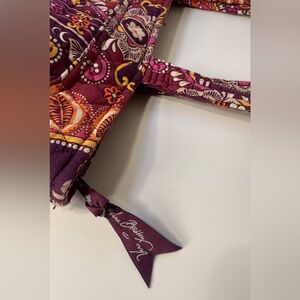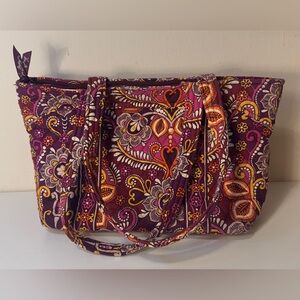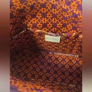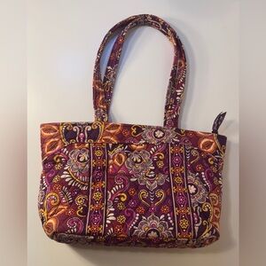 Vera Bradley Safari Sunset tote. Approx 15"x9-1/2"x5" strap drop approx 10-1/2". 6 interior slip pockets, 1 small exterior slip pocket. Double handles. Beautiful shades of burgundy, gold, purple and orange.