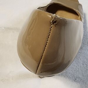 Chic peep-toe heels with a glossy patent finish in a versatile nude color. Ideal for elevating any outfit from the office to a night out. 4" heels. size 7.5